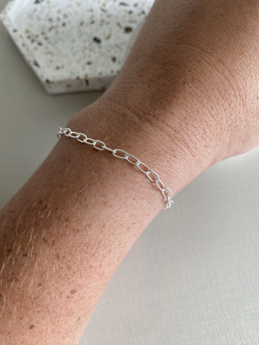 Apresentamos a nossa deslumbrante pulseira de elos ovais, com pequenos detalhes de riscos em prata 925, uma verdadeira obra-prima de elegância e sofisticação. Cada elo oval é meticulosamente trabalhado em prata esterlina de alta qualidade, exibindo um brilho suave e um acabamento polido deslumbrante.