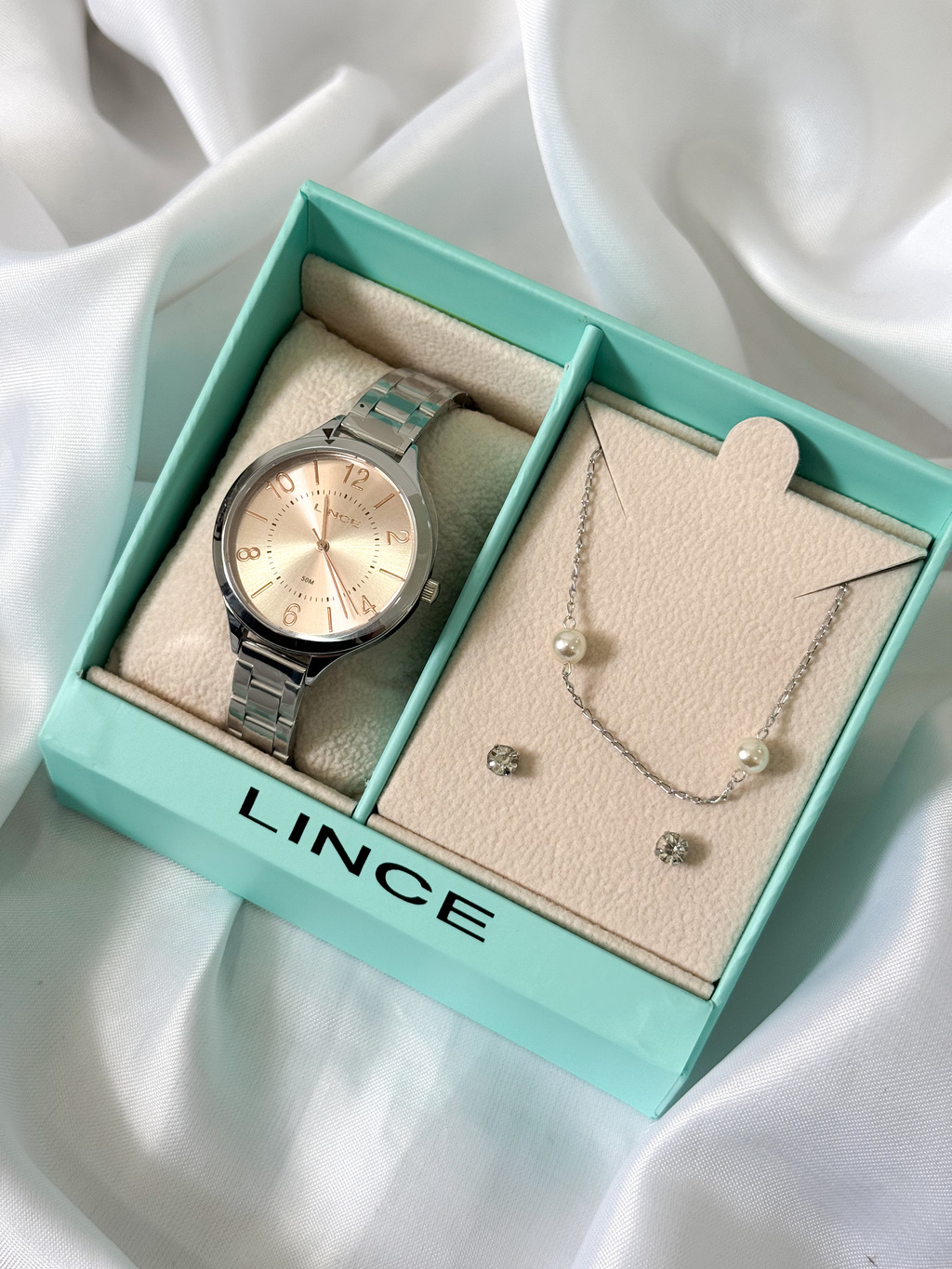 Este modelo faz parte da linha de kits femininos da Lince e acompanha uma delicada gargantilha e um par de brincos, tornando-o uma opção perfeita para presentear ou se presentear. Os acessórios são brindes e podem sofrer variações.
