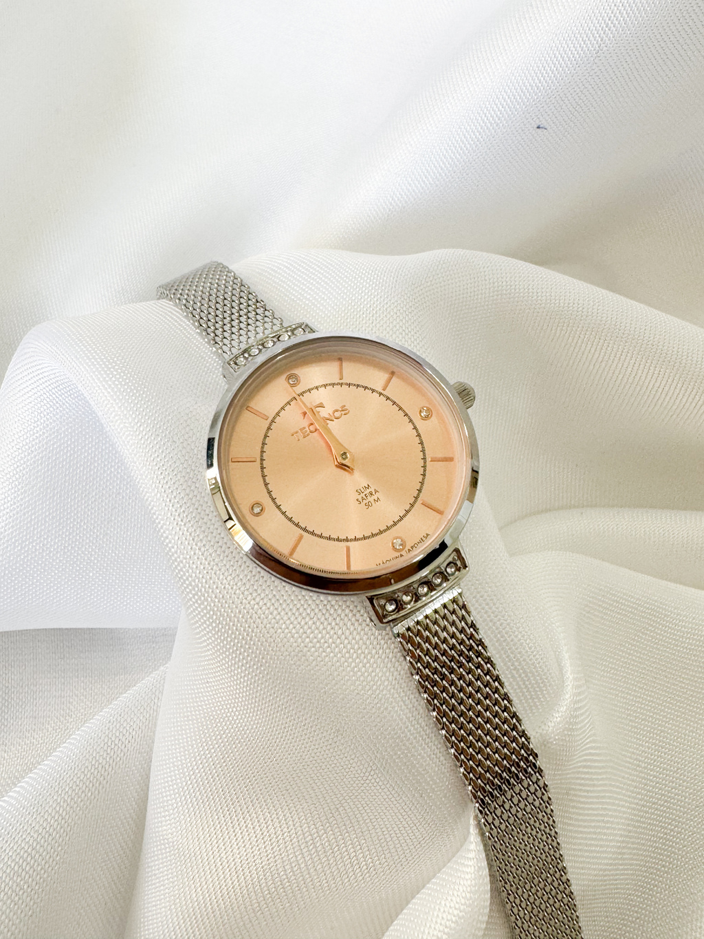 Destaque para a lente de safira, que proporciona alta resistência contra riscos, e para os detalhes em pedras aplicadas nos terminais da pulseira e no mostrador, que trazem brilho sutil e feminino. O mostrador rosé assinado complementa o design com charme e exclusividade.